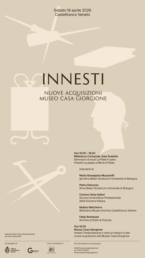 Fin dal progetto "Dar voce al Fregio" del 2022 il Museo Giorgione, luogo di studio e approfondimento della figura, dell'opera e del primo mito del grande artista, arricchisce il proprio percorso espositivo permanente con nuovi e significativi oggetti, ora presentati con un filo conduttore uniforme: nuove acquisizioni, donazioni, indagini, recuperi, restauri, studi, soluzioni multimediali, valorizzazione del patrimonio museale cittadino. Veri e propri innesti. Tra le nuove acquisizioni si segnala un rilievo lapideo (XV-XVI secolo) di Cristo in pietà proveniente dall'antico Monte di Pietà di Castelfranco, salvato dal degrado, restaurato e "innestato" nel Museo Giorgione. Per svelarne la natura e la storia il rilievo è al centro del seminario di studi "La Pietà in salvo".